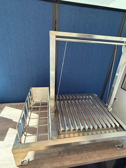 - This exciting BBQ grill top is designed to either fit your existing DIY brick BBQ or alternatively you could build it into an outdoor kitchen. Made from high grade stainless steel and a removable heavy duty V grate stainless grill, with built in brasero, this product makes cooking even more versatile and fun. The grease pan is removable for easy clean up. Using the handle to the right of the cooking area you are able to raise and lower the grill to your desired cooking height, making it much easier to get the cooking temperature for the food just right. The cooking height is adjustable by holding the adjustment lever while rotating the wheel. The cooking area is (20.5 inches by 19 inches each). The design enables the frame to be taken apart easily with the uprights simply sliding out, the wheel can be removed by two locking nuts and the bar for supporting the grill slides out from the uprights. There are instructions included for product assembly. Assembly is very easy and intutitive.